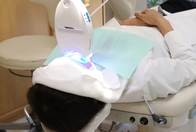 ホワイトニングの効果を最大限に引き出すため、まず虫歯や歯周病がないかお口の中全体を確認します。施術前に専用の器具を使って歯の表面の汚れや歯石を丁寧に除去し、薬剤が均一に作用して効果が高まるように整えます。